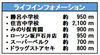 | 学区 | 小学校区:勝呂小学校 850m 中学校区:住吉中学校 1,300m |