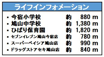 | 学区 | 小学校区:今宿小学校 880m 中学校区:鳩山中学校 1,380m |