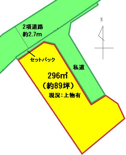 | 接道 | 北西 2.7m(幅員) 42条2項道路 北東 私道 |