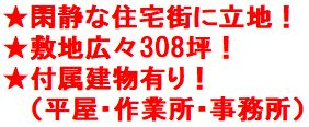 閑静な住宅街に立地!敷地広々308坪!付属建物有(平屋・作業所・事務所)