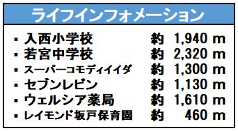 | 学区 | 小学校区:入西小学校 1,940m 中学校区:若宮中学校 2,320m |