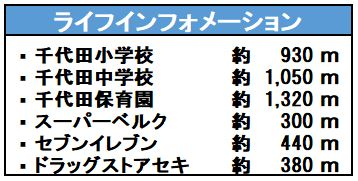 | 学区 | 小学校区:千代田小学校 930m 中学校区:千代田中学校 1,050m |