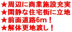 周辺に商業施設充実、生活に便利!閑静な住宅街に立地!前面道路6m!建築条件無しのため、お好きなハウスメーカーで建築できます!