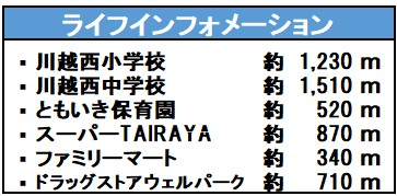 | 学区 | 小学校区:川越西小学校 1,230m 中学校区:川越西中学校 1,510m |