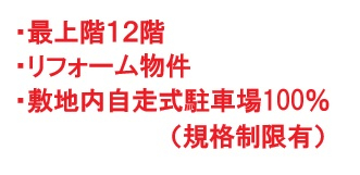 エレベータ、ペット飼育可(細則有)、二階以上、最上階、宅配ボックス、駐車場、都市ガス、リフォーム、空室