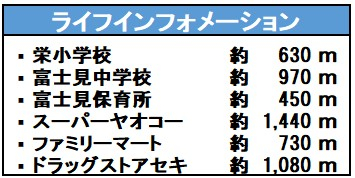 | 学区 | 小学校区:栄小学校 630m 中学校区:富士見中学校 970m |