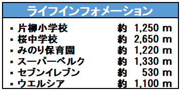 | 学区 | 小学校区:片柳小学校 1,250m 中学校区:桜中学校 2,650m |