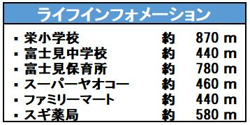 | 学区 | 小学校区:栄小学校 870m 中学校区:富士見中学校 440m |