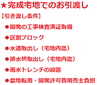 建築条件なし、調整34条11号(何方でも可)、公営水道、排水(道路側溝)、農地転用・開発許可が必要です、完成宅地でのお引渡し、文化財包蔵地、ナビ:北峰166-3付近、水害ハザードマップ:該当なし、引渡しにお願いがあります