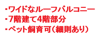 エレベータ、ペット飼育可(細則有)、二階以上、都市ガス、空室、ルーフバルコニー使用料800円/月、駐輪場(各戸サービスルームへ駐輪)