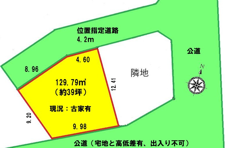 | 接道 | 北西 4.2m(幅員) 位置指定道路 13.5m(接面) 南東 公道 9.9m(接面) |