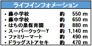 | 学区 | 小学校区:藤小学校 550m 中学校区:藤中学校 650m |