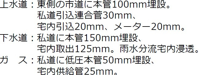 建築条件なし、南道路、公営水道、公共本下水、都市ガス、現況渡し:古家有(木造2階建)、水害ハザードマップ:該当なし、法22条区域、私道持分:113㎡×1/7、注意事項有