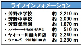 | 学区 | 小学校区:芳野小学校 2,100m 中学校区:芳野中学校 2,000m |