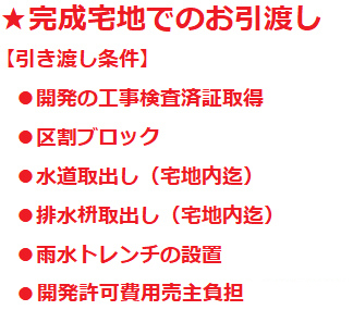 建築条件なし、調整34条11号(何方でも可)、南道路・角地、公営水道、浄化槽・排水(道路側溝)、プロパンガス、開発許可が必要です、完成宅地でのお引渡し、水害ハザードマップ:該当なし、ナビ:新堀150-1