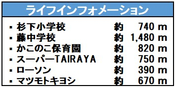 | 学区 | 小学校区:杉下小学校 740m 中学校区:藤中学校 1,480m |