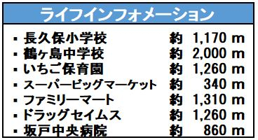 | 学区 | 小学校区:長久保小学校 1,170m 中学校区:鶴ヶ島中学校 2,000m |
