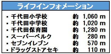 | 学区 | 小学校区:千代田小学校 1,060m 中学校区:千代田中学校 1,020m |
