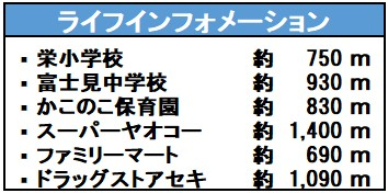 | 学区 | 小学校区:栄小学校 750m 中学校区:富士見中学校 930m |