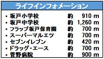 | 学区 | 小学校区:坂戸小学校 910m 中学校区:坂戸中学校 1,260m |